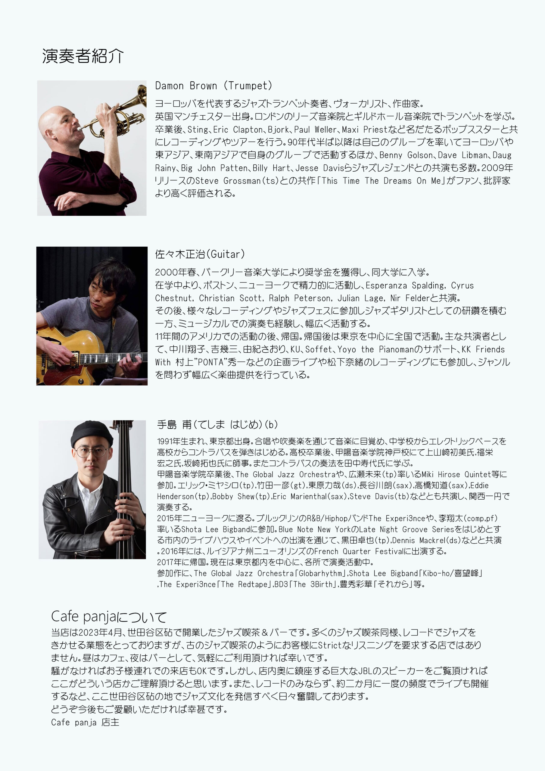 | 出演:Damon Brown(tp) 佐々木正治(g) 手島甫(b) 場所:当店(Cafe & Bar Jazz Panja) 料金:ミュージックチャージ ご予約¥4000+ドリンク ・ 当日¥4500+ドリンク 予約:当店あてメール(Café Panja cafepanja@gmail.com)もしくは店頭でもご予約承ります。 メールにはお名前と連絡可能な電話番号も併せて記載ください。 |